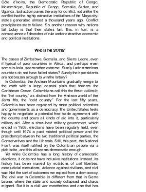 Côte d’ Ivoire, the Democratic Republic of Congo, Mozambique, Republic of Congo, Somalia, Sudan, and Uganda. Extraction paves the way for conflict, not unlike the conflict that the highly extractive institutions of the Maya citystates generated almost a thousand years ago. Conflict precipitates state failure. So another reason why nations fail today is that their states fail. This, in turn, is a consequence of decades of rule under extractive economic and political institutions.