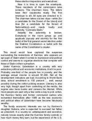 Under Karimov, Uzbekistan is a country with very extractive political and economic institutions. And it is poor. Probably one-third of the people live in poverty, and the average annual income is around $ 1,000. Not all the development indicators are bad. According to World Bank data, school enrollment is 100 percent … well, except possibly during the cotton picking season. Literacy is also very high, though apart from controlling all the media, the regime also bans books and censors the Internet. While most people are paid only a few cents a day to pick cotton, the Karimov family and former communist cadres who reinvented themselves after 1989 as the new economic and political elites of Uzbekistan have become fabulously wealthy. The family economic interests are run by Karimov’ s daughter Gulnora, who is expected to succeed her father as president. In a country so untransparent and secretive, nobody knows exactly what the Karimov family controls or how much money they earn, but the experience of the U. S.