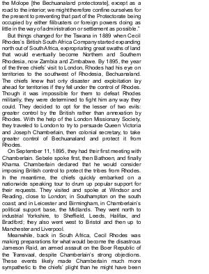 But things changed for the Tswana in 1889 when Cecil Rhodes’ s British South Africa Company started expanding north out of South Africa, expropriating great swaths of land that would eventually become Northern and Southern Rhodesia, now Zambia and Zimbabwe. By 1895, the year of the three chiefs’ visit to London, Rhodes had his eye on territories to the southwest of Rhodesia, Bechuanaland. The chiefs knew that only disaster and exploitation lay ahead for territories if they fell under the control of Rhodes. Though it was impossible for them to defeat Rhodes militarily, they were determined to fight him any way they could. They decided to opt for the lesser of two evils: greater control by the British rather than annexation by Rhodes. With the help of the London Missionary Society, they traveled to London to try to persuade Queen Victoria and Joseph Chamberlain, then colonial secretary, to take greater control of Bechuanaland and protect it from Rhodes.