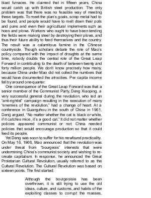 Yet Deng was soon to suffer for his newfound practicality. On May 16, 1966, Mao announced that the revolution was under threat from“ bourgeois” interests that were undermining China’ s communist society and wishing to recreate capitalism. In response, he announced the Great Proletarian Cultural Revolution, usually referred to as the Cultural Revolution. The Cultural Revolution was based on sixteen points. The first started: