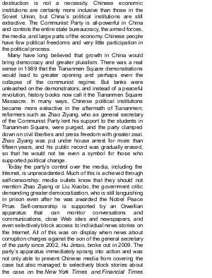 Today the party’ s control over the media, including the Internet, is unprecedented. Much of this is achieved through self-censorship: media outlets know that they should not mention Zhao Ziyang or Liu Xiaobo, the government critic demanding greater democratization, who is still languishing in prison even after he was awarded the Nobel Peace Prize. Self-censorship is supported by an Orwellian apparatus that can monitor conversations and communications, close Web sites and newspapers, and even selectively block access to individual news stories on the Internet. All of this was on display when news about corruption charges against the son of the general secretary of the party since 2002, Hu Jintao, broke out in 2009. The party’ s apparatus immediately sprang into action and was not only able to prevent Chinese media from covering the case but also managed to selectively block stories about the case on the New York Times and Financial Times