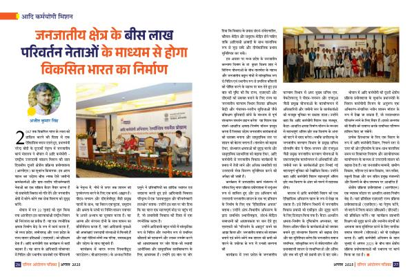 के नेतृतव में, नीचे से ऊपर तक शासन की पुनर्कलपिा करने के क्लए एक कार्य-आह्ाि है । पीएम-जनमन और डीएजेजीयूए जैसी प्रमुख पहलनों के साथ, यह क्मशन एकजुटता, समुदाय और क्षमता के सतंभनों पर क्िक्म्वत शासन नवाचार के अगले अधयाय का सूरिपात करता है । यह आतमा और संरचना दोिनों के साथ शासन का प्रक्तक्िक्धतव करता है, जहां आक्दवासी युवाओं की आकांक्षाएं उत्रदायी संस्ाओं से क्मलती हैं और जहां नीक्तयां लोगनों तक गरिमा, समयबद्धता और उद्ेशय के साथ पहुंचती हैं ।