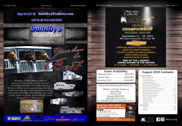 From the Committees WSCA Administration ................................................................... 4 WSCA Judges List ......................................................................... 5 Board Meeting Minutes .............................................................. 6-7 Upcoming Meetings ...................................................................... 8 WSCA Digital Spotlight Library ................................................... 8 2023 Champ Show Important Dates ............................................. 9 2023 Champ Show Showbill ........................................................ 10 2023 Champ Show General Rules and Info ............................ 11-13 2023 Champ Show Sponsorship Info ..................................... 14-16 2023 Champ Show Vendor Form ................................................ 17 `2023 Champ Show Futurity ........................................................ 18 2023 WSCA Club Information .............................................. 19-21 Royalty Contest Banquest ........................................................... 22 Queen ’ s Message ........................................................................ 23 Meet Your Royalty ....................................................................... 24 Showbill Advertising .................................................................... 50 Ad Rates ...................................................................................... 51