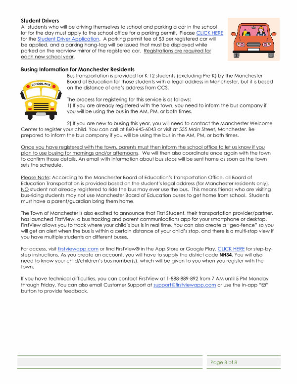 Please Note: According to the Manchester Board of Education’ s Transportation Office, all Board of Education Transportation is provided based on the student’ s legal address( for Manchester residents only). NO student not already registered to ride the bus may ever use the bus. This means friends who are visiting bus-riding students may not use Manchester Board of Education buses to get home from school. Students must have a parent / guardian bring them home.