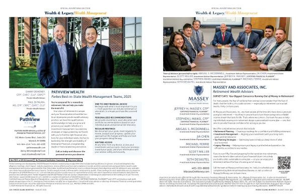 Forbes rankings are developed by SHOOK Research and are created using an algorithm that includes both qualitative( in-person, virtual and telephone due diligence meetings; client impact; industry experience; review of best practices and compliance records; and firm nominations) and quantitative( assets under management and revenue generated for their firms) data. Investment performance is not a criterion because client objectives and risk tolerances vary, and advisors rarely have audited performance reports. Certain awards include a demographic component to qualify. These rankings for each applicable year are based on the opinions of SHOOK Research, LLC, are not indicative of future performance or representative of any one client’ s experience and are based on data from the previous two calendar years. Forbes magazine and SHOOK Research do not receive compensation in exchange for placement on the ranking or its use. For more information: www. SHOOKresearch. com. SHOOK is a registered trademark of SHOOK Research, LLC. Certified Financial Planner Board of Standards Inc. owns the certification marks CFP ®, CERTIFIED FINANCIAL PLANNER™ and CFP ® certification mark( with plaque design) logo in the U. S. Ameriprise Financial does not offer tax or legal advice. Consult with a tax advisor or attorney. Ameriprise Financial cannot guarantee future financial results. Securities offered by Ameriprise Financial Services, LLC. Member FINRA and SIPC. © 2025 Ameriprise Financial, Inc. All rights reserved.