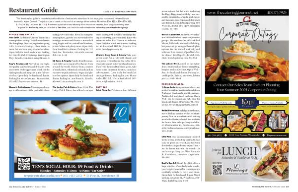 This directory is a guide to the cuisine and ambience of restaurants advertised in this issue, plus restaurants reviewed by our food critic, Karen Deutsch. The price scale is based on the cost of an average dinner entree. More than $ 30: $$$$; $ 24 –$ 30: $$$; $ 17 –$ 23: $$; Less than $ 17: $ ♨ Reviewed by Rhode Island Monthly. Find restaurant reviews, food blogs and dining news anytime on RIMonthly. com, or subscibe to The Dish, our food-focused e-newsletter. rimonthly. com / newsletter-sign-up