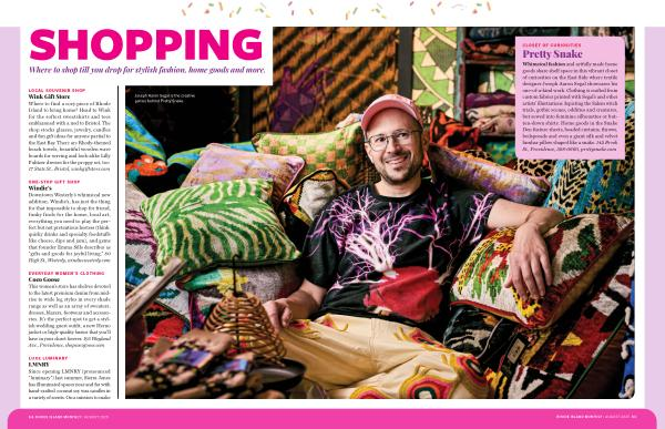 Whimsical fashion and artfully made home goods share shelf space in this vibrant closet of curiosities on the East Side where textile designer Joseph Aaron Segal showcases his one-of-a-kind work. Clothing is crafted from custom fabrics printed with Segal’ s and other artists’ illustrations depicting the Salem witch trials, gothic scenes, oddities and creatures, but sewed into feminine silhouettes or button-down shirts. Home goods in the Snake Den feature sheets, beaded curtains, throws, bedspreads and even a giant silk and velvet lumbar pillow shaped like a snake. 142 Brook St., Providence, 388-0660, prettysnake. com
