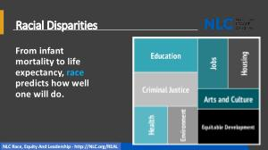 Racial Disparities From infant mortality to life expectancy, race predicts how well one will do. NLC Race, Equity And Leadership - http://NLC.org/REAL