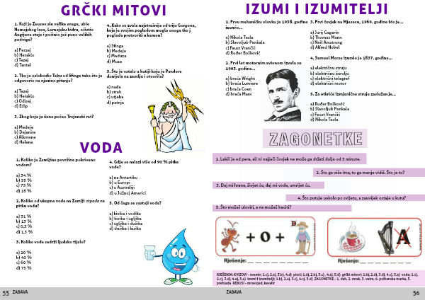 RJEŠENJA: KVIZOVI - svemir; 1.c), 2.a), 3.b), 4.d) pisci; 1.d), 2.b), 3.c) , 4.a), 5.d) grčki mitovi; 1.b), 2.d), 3.d), 4.c), 5.a) voda; 1.c), 2.c), 3.d), 4.a), 5.a) izumi i izumitelji; 1.b), 2.a), 3.c), 4.c), 5.d) ZAGONETKE - 1. dah, 2. mrak, 3. vatra, 4. poštanska marka, 5. prehlada REBUSI - mravojed, kavalir