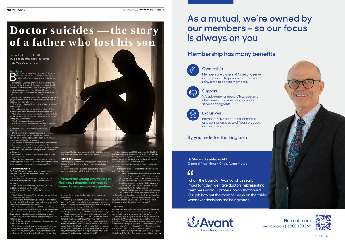 Australian Doctor has contacted Calvary Mater Newcastle to ensure right of reply. It did not respond directly to a question about whether David had been told he had a black mark against his name. But a statement from the hospital’ s general manager, Roslyn Everingham, stressed the hospital was committed to providing a safe and supportive workplace for staff.