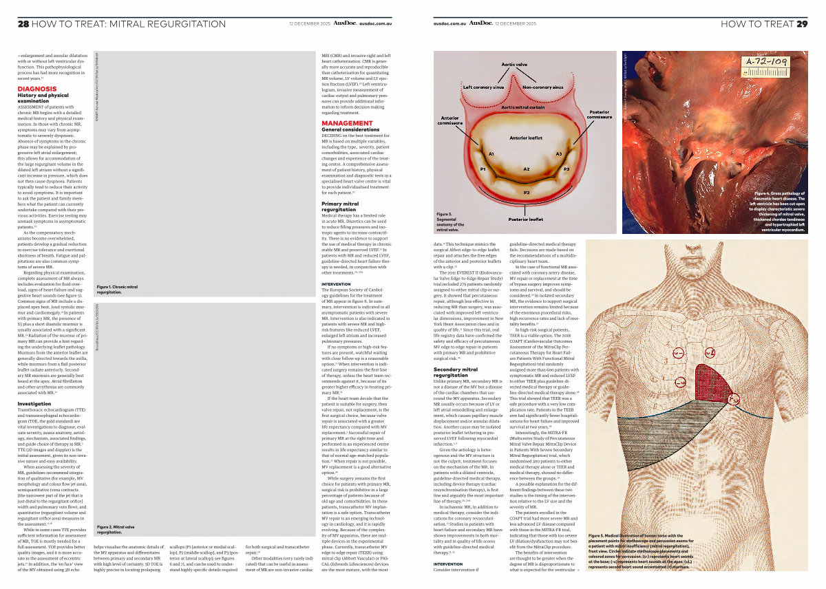 In ischaemic MR, in addition to medical therapy, consider the indications for coronary revascularisation. 13 Studies in patients with heart failure and secondary MR have shown improvements in both mortality and in quality of life scores with guideline-directed medical