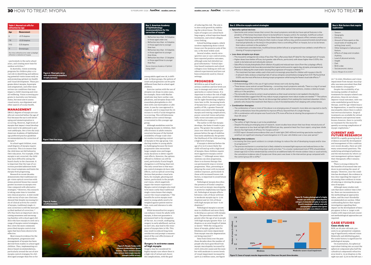 SMALL degrees of myopia are usually not corrected before the age of four because the eye is still developing and emmetropisation is occurring. However, high levels of myopia that impact visual development need to be addressed to prevent amblyopia. Box 2 lists the 2022 American Academy of Ophthalmology preferred practice guideline recommendations for correction of myopia. 18