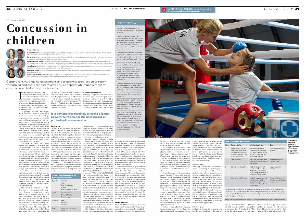IN Australia, concussion is a frequent presentation among children and adolescents in both emergency and primary care settings. Diagnosis requires a plausible mechanism of injury and the presence of clinical symptoms and / or signs that cannot be explained by other confounding factors or other injuries. 1-3