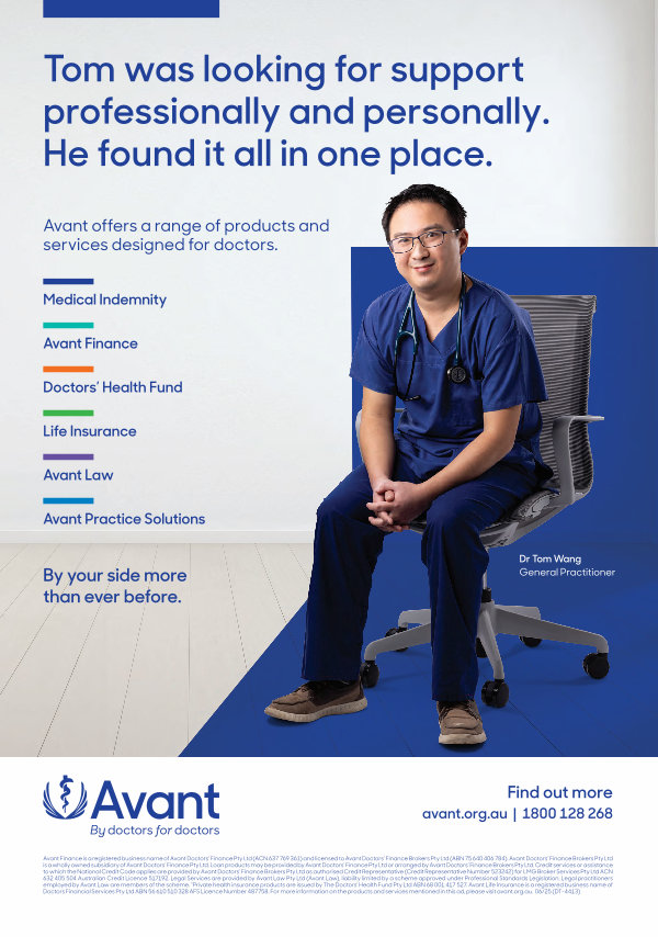 Avant Finance is a registered business name of Avant Doctors’ Finance Pty Ltd( ACN 637 769 361) and licensed to Avant Doctors’ Finance Brokers Pty Ltd( ABN 75 640 406 784). Avant Doctors’ Finance Brokers Pty Ltd is a wholly owned subsidiary of Avant Doctors’ Finance Pty Ltd. Loan products may be provided by Avant Doctors’ Finance Pty Ltd or arranged by Avant Doctors’ Finance Brokers Pty Ltd. Credit services or assistance to which the National Credit Code applies are provided by Avant Doctors’ Finance Brokers Pty Ltd as authorised Credit Representative( Credit Representative Number 523242) for LMG Broker Services Pty Ltd ACN 632 405 504 Australian Credit Licence 517192. Legal Services are provided by Avant Law Pty Ltd( Avant Law), liability limited by a scheme approved under Professional Standards Legislation. Legal practitioners employed by Avant Law are members of the scheme. " Private health insurance products are issued by The Doctors ' Health Fund Pty Ltd ABN 68 001 417 527. Avant Life Insurance is a registered business name of Doctors Financial Services Pty Ltd ABN 56 610 510 328 AFS Licence Number 487758. For more information on the products and services mentioned in this ad, please visit avant. org. au. 06 / 25( DT-4413)