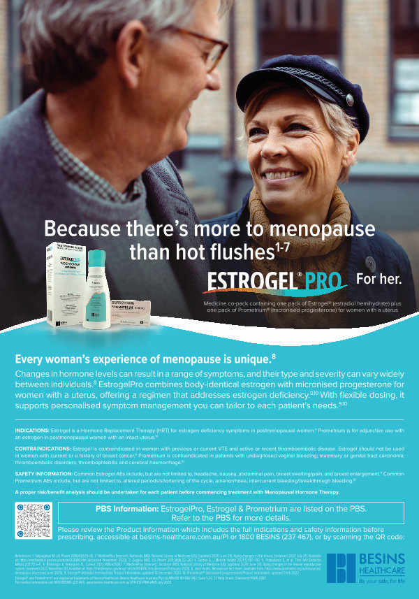 References: 1. Saljoughian M. US Pharm 2018; 43( 1): 13 – 16. 2. MedlinePlus [ Internet ]. Bethesda( MD): National Library of Medicine( US); [ updated 2020 June 24 ]. Aging changes in the breast; [ reviewed 2022 July 21 ]. Available at: https:// medlineplus. gov / ency / article / 003999. htm( Accessed November 2023). 3. Zagaria MAE. US Pharm 2011; 36( 9): 22 – 26.] 4. Fenton A. J Mid-life Health 2021; 12:187 – 192. 5. Prabakaran S, et al. Ther Adv Endocrin Metab 2021; 12:1 – 11. 6. Bhatnagar A, Kekatpure AL. Cureus 2022; 14( 9): e29367. 7. MedlinePlus [ Internet ]. Jacobson( MD): National Library of Medicine( US); [ updated 2020 June 24 ]. Aging changes in the female reproductive system; [ reviewed 2022 November 10 ]. Available at: https:// medlineplus. gov / ency / article / 004016. htm( Accessed February 2025). 8. Jean Hailes. Menopause fact sheet. Available from: https:// www. jeanhailes. org. au / resources / menopause( Accessed June 2025). 9. Estrogel ®( estradiol hemihydrate) Product Information, updated 18 December 2023. 10. Prometrium ®( micronised progesterone) Product Information, updated 1 Feb 2022. Estrogel ® and Prometrium ® are registered trademarks of Besins Healthcare. Besins Healthcare Australia Pty Ltd ABN 68 164 882 062. Suite 5.02, 12 Help Street, Chatswood NSW 2067. For medical information call 1800 BESINS( 237 467). www. besins-healthcare. com. au EPR-EST-PRM-2465 July 2025.