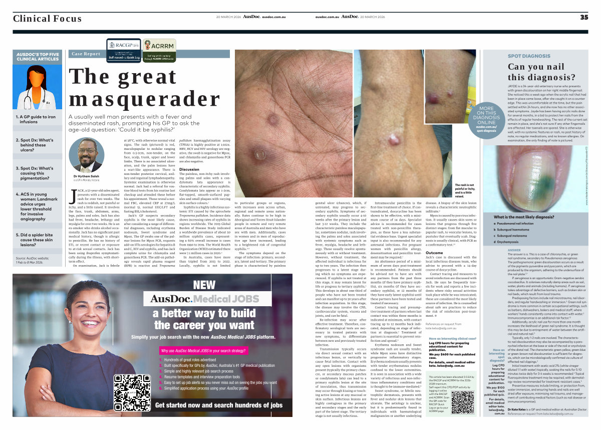 Jack’ s GP suspects secondary syphilis is the most likely cause,