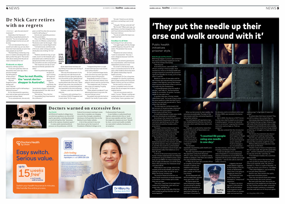 In retirement, Dr Carr, a long-time campaigner for voluntary euthanasia, plans to keep working with Dying with Dignity Victoria, just not as a clinician. He also wants to write more— he has a completed novel in his desk drawer. But do not expect him to pen a medical memoir.