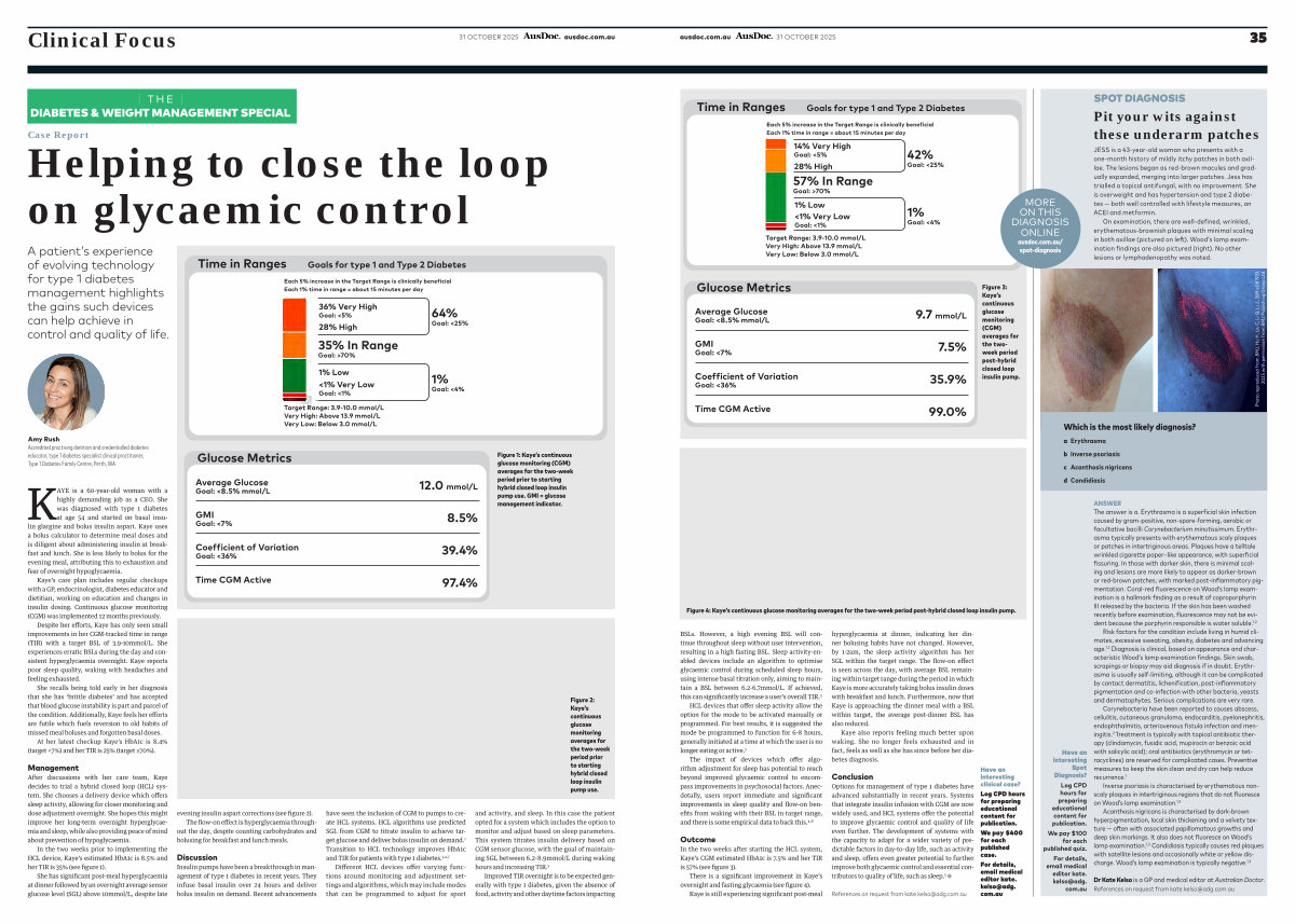 Despite her efforts, Kaye has only seen small improvements in her CGM-tracked time in range( TIR) with a target BSL of 3.9-10mmol / L. She experiences erratic BSLs during the day and consistent hyperglycaemia overnight. Kaye reports poor sleep quality, waking with headaches and feeling exhausted.