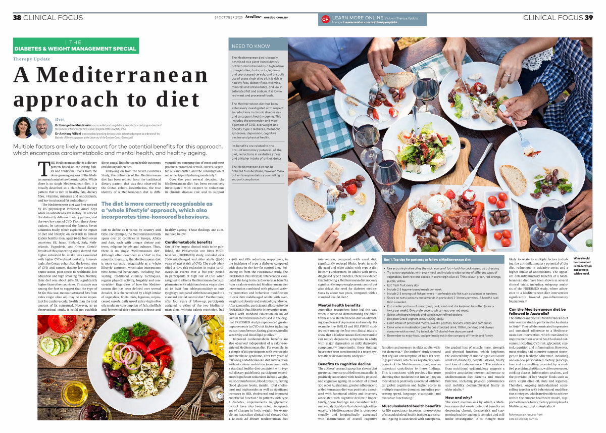 The Mediterranean diet can be adhered to in Australia, however many patients require dietary counselling to support compliance.