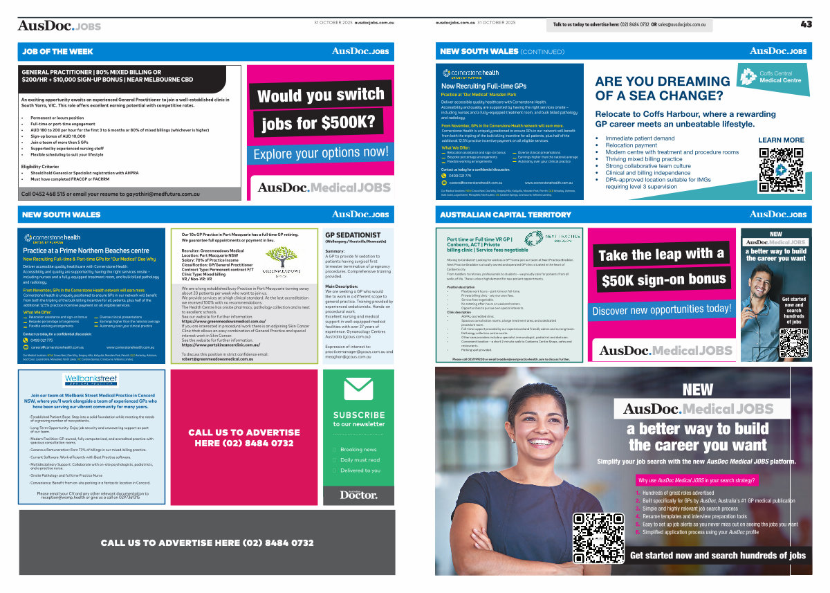 1. Hundreds of great roles advertised 2. Built specifically for GPs by AusDoc, Australia’ s # 1 GP medical publication 3. Simple and highly relevant job search process 4. Resume templates and interview preparation tools 5. Easy to set up job alerts so you never miss out on seeing the jobs you want 6. Simplified application process using your AusDoc profile