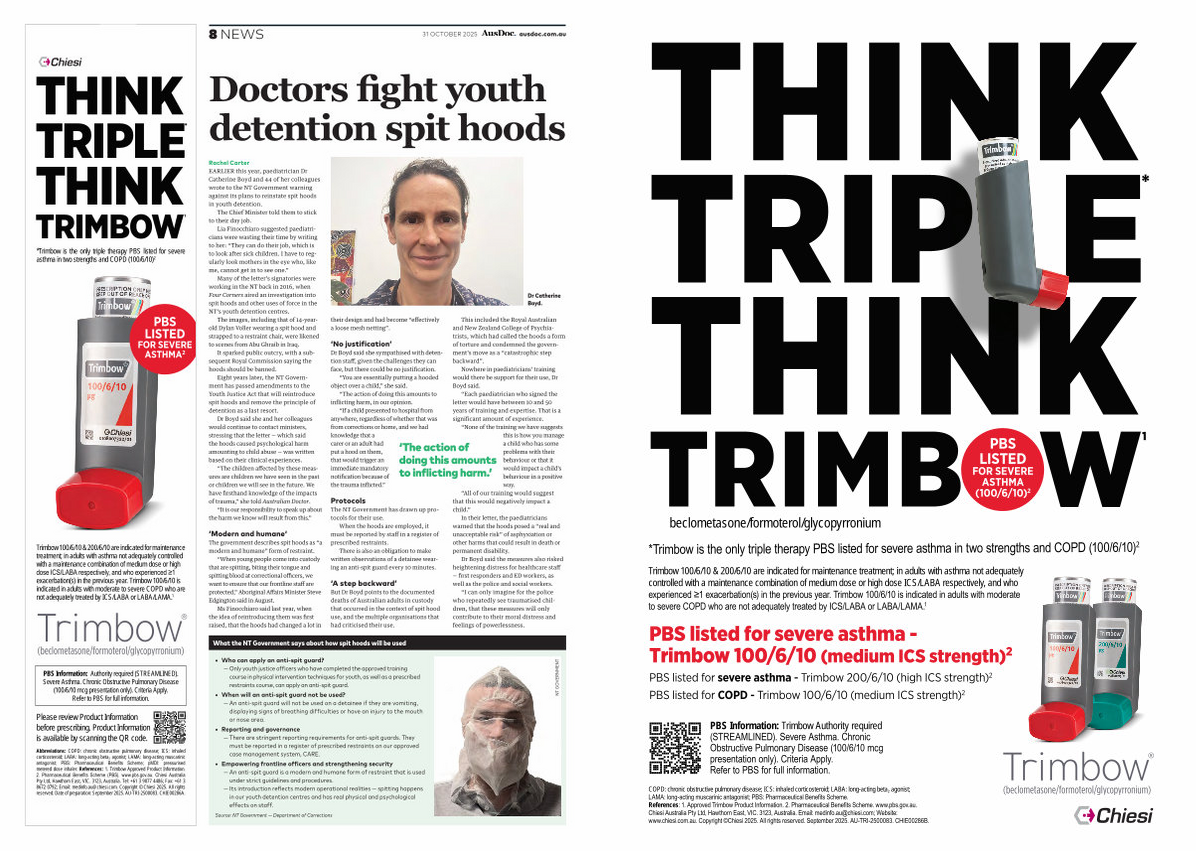 Rachel Carter EARLIER this year, paediatrician Dr Catherine Boyd and 44 of her colleagues wrote to the NT Government warning against its plans to reinstate spit hoods in youth detention.