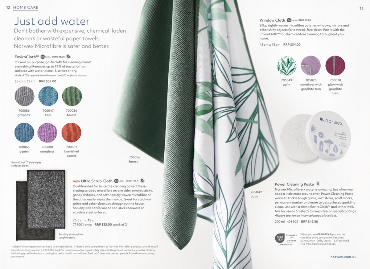 * When following proper care and use instructions. ** Based on a comparison of Norwex Microfibre products to 18 retail brand cleaning products, 2020. BacLock ® is an antimicrobial agent solely intended to protect and self-clean the cloth by inhibiting growth of odour-causing bacteria, mould and mildew. BacLock ® does not protect people from disease-causing pathogens.