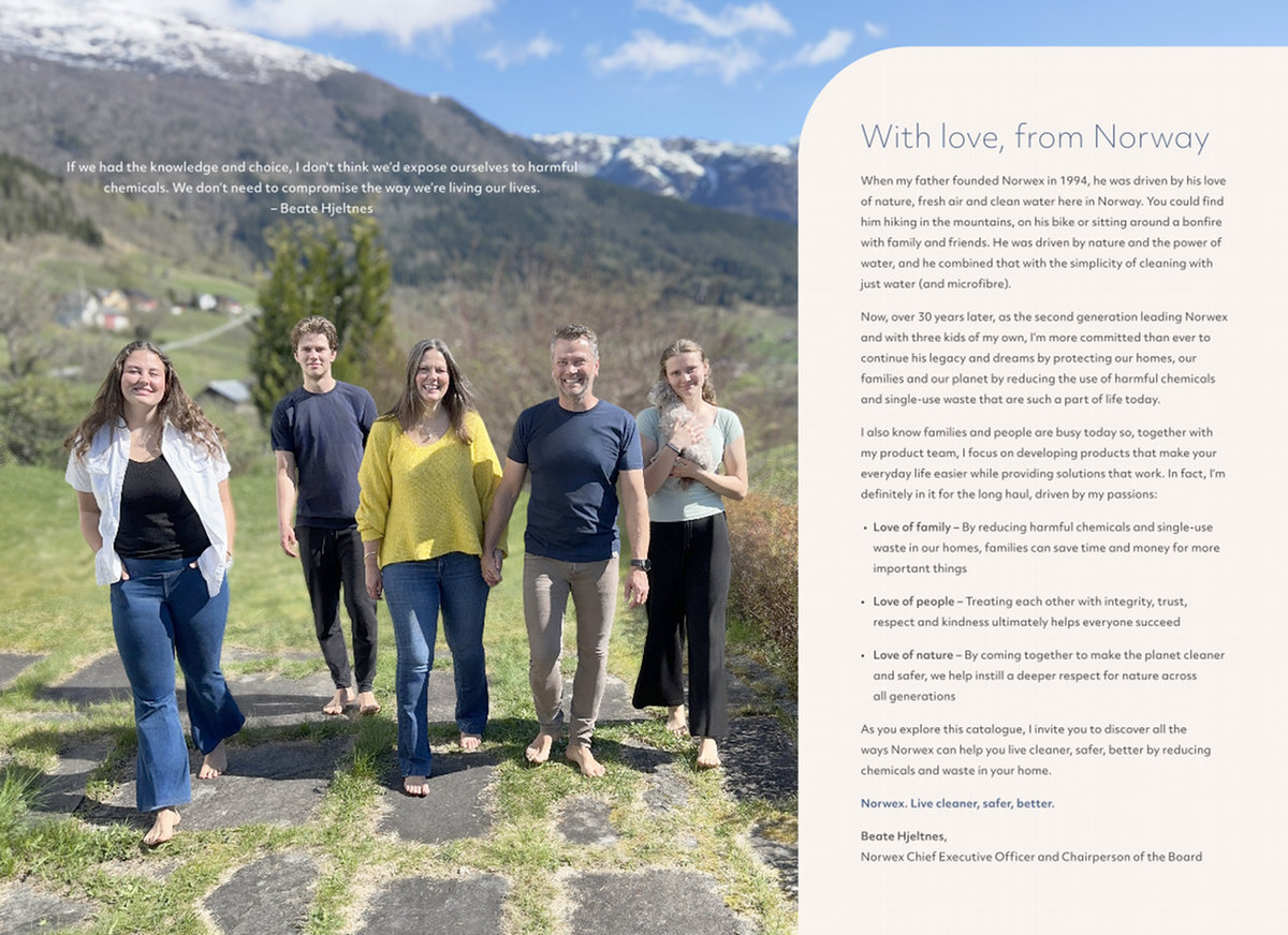 When my father founded Norwex in 1994, he was driven by his love of nature, fresh air and clean water here in Norway. You could find him hiking in the mountains, on his bike or sitting around a bonfire with family and friends. He was driven by nature and the power of water, and he combined that with the simplicity of cleaning with just water( and microfibre).