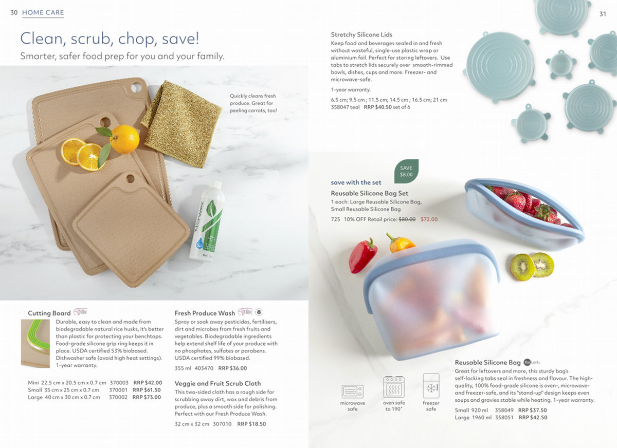 Cutting Board Durable, easy to clean and made from biodegradable natural rice husks, it ' s better than plastic for protecting your benchtops. Food-grade silicone grip ring keeps it in place. USDA certified 53 % biobased. Dishwasher safe( avoid high heat settings). 1-year warranty.