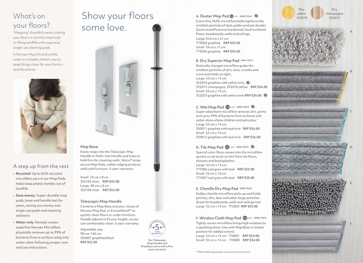 C. Wet Mop Pad Super-absorbent microfibre removes dirt, grime and up to 99 % of bacteria from surfaces with water alone where children and pets play. ** Large 52 cm x 14 cm 350011 graphite with teal trim RRP $ 56.00 Small 32 cm x 14 cm 350012 graphite with teal trim RRP $ 36.00 |