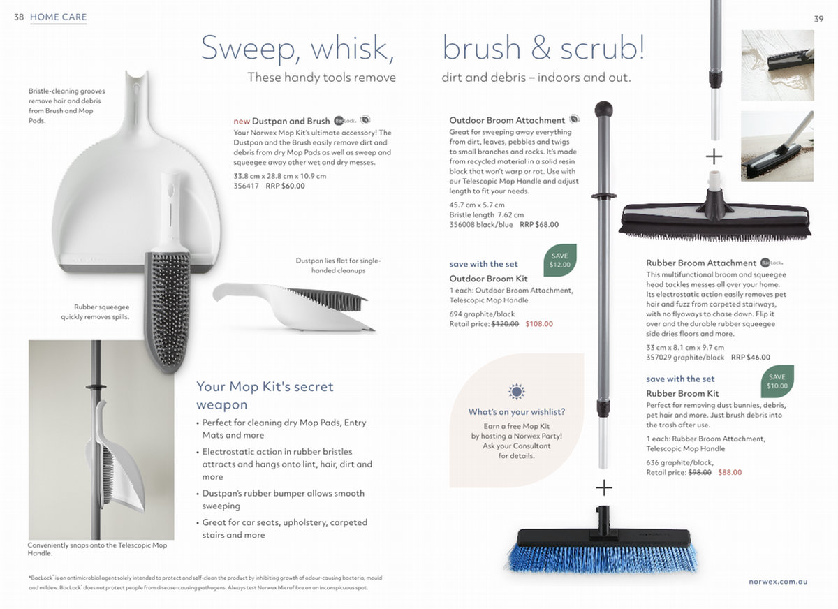 new Dustpan and Brush Your Norwex Mop Kit’ s ultimate accessory! The Dustpan and the Brush easily remove dirt and debris from dry Mop Pads as well as sweep and squeegee away other wet and dry messes.