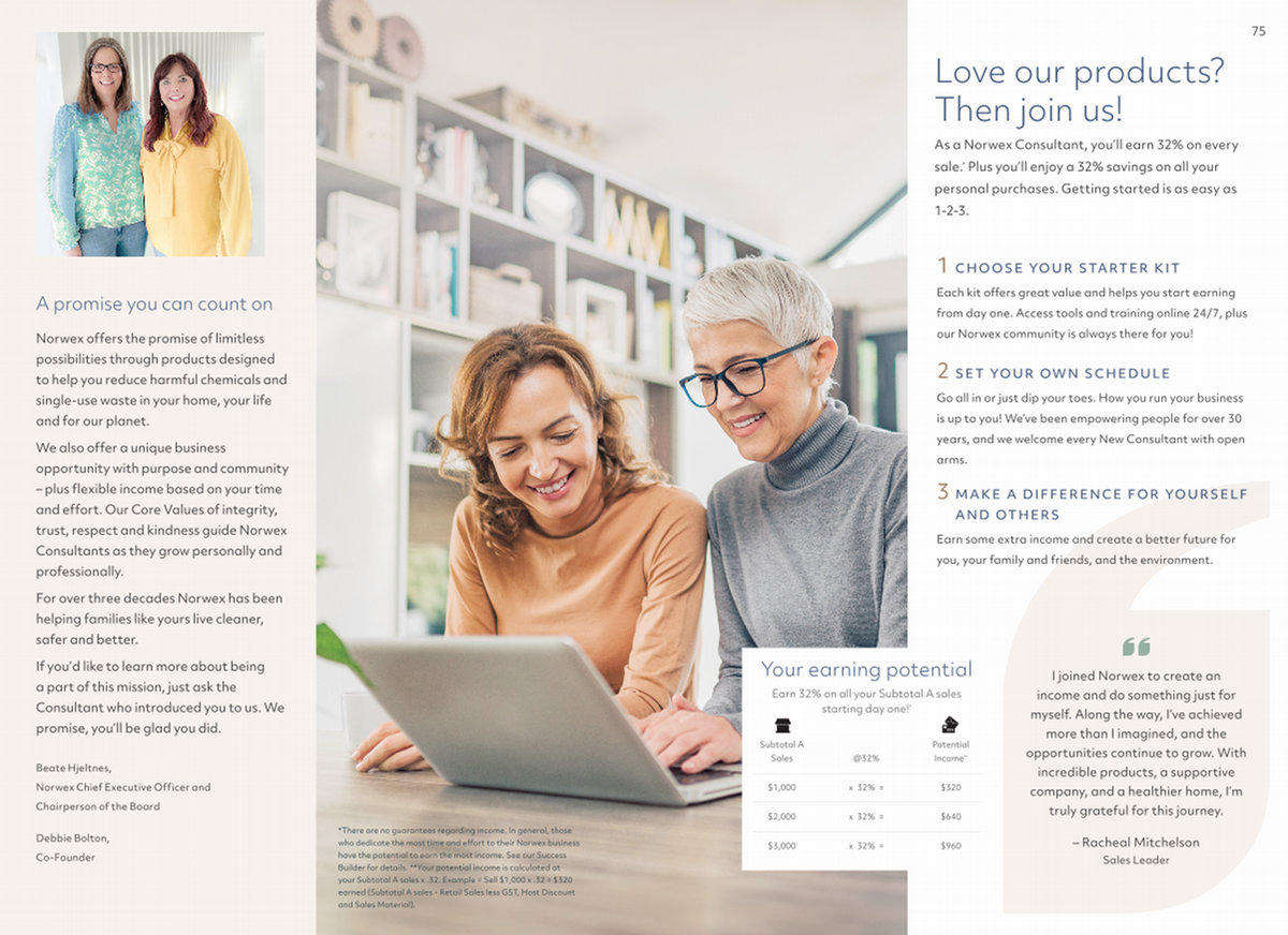 We also offer a unique business opportunity with purpose and community – plus flexible income based on your time and effort. Our Core Values of integrity, trust, respect and kindness guide Norwex Consultants as they grow personally and professionally.