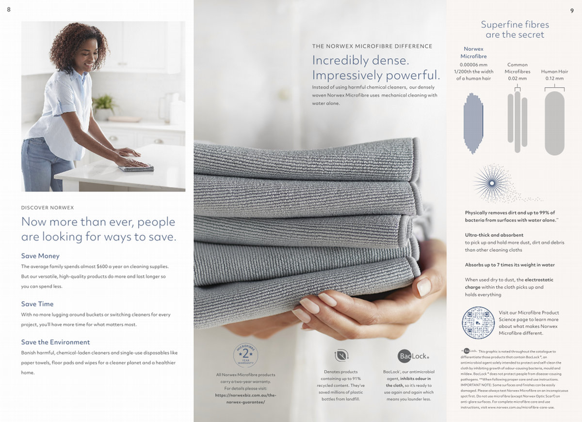 * This graphic is noted throughout the catalogue to differentiate those products that contain BacLock ®, an antimicrobial agent solely intended to protect and self-clean the cloth by inhibiting growth of odour-causing bacteria, mould and mildew. BacLock ® does not protect people from disease-causing pathogens. ** When following proper care and use instructions. IMPORTANT NOTE: Some surfaces and finishes can be easily damaged. Please always test Norwex Microfibre on an inconspicuous spot first. Do not use microfibre( except Norwex Optic Scarf) on norwex. com. au