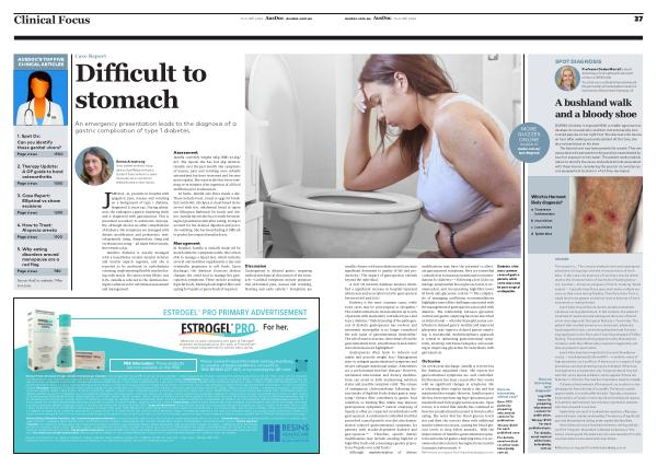 Six weeks post-discharge , Jamilla is reviewed in the dietitian outpatient clinic . She reports her gastrointestinal symptoms are well controlled . Erythromycin has been ceased after four weeks with no significant changes in symptoms . She is tolerating three regular meals a day and has maintained her weight . However , Jamilla reports she has been experiencing hyperglycaemia postmeals followed by hypoglycaemic episodes . Upon review , it is noted that Jamilla has continued to have her prandial insulin around 15 minutes after eating . She notes that her blood glucose levels rise and then she corrects these with additional insulin within two hours , causing her blood glucose levels to drop below 4mmol / L . With the improvement of Jamilla ’ s gastrointestinal symptoms and reduced gastric emptying time , it is recommended she return to having her bolus insulin 15 minutes before meals . References on request from kate . kelso @ adg . com . au