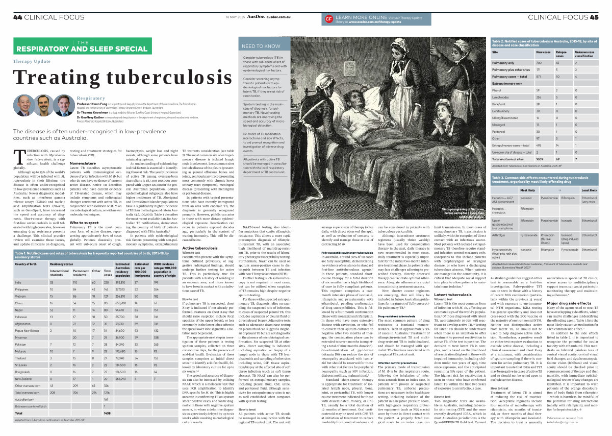 Although up to 25 % of the world’ s population will be infected with M. tuberculosis in their lifetime, the disease is often under-recognised in low-prevalence countries such as Australia. 1 Newer diagnostic modalities, such as interferon gamma release assays( IGRAs) and nucleic acid amplification tests( NAATs), such as GeneXpert, have increased the speed and accuracy of diagnosis. Short-course therapy with first-line antimicrobials is well tolerated with high cure rates, however emerging drug resistance presents a challenge. This clinical practice review will examine these issues, and update clinicians on diagnosis, testing and treatment strategies for tuberculosis( TB).