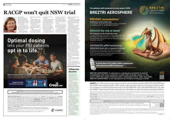 BID = twice daily ; BUD = budesonide ; CI = confidence interval ; COPD = chronic obstructive pulmonary disease ; ETHOS = The Efficacy and Safety of Triple Therapy in Obstructive Lung Disease ; FORM = formoterol ; GLY = glycopyrronium ; HR = hazard ratio ; ICS = inhaled corticosteroid ; LABA = long-acting beta 2 agonist ; LAMA = long-acting muscarinic antagonist ; MDI = metered dose inhaler ; pMDI = pressurised Metered Dose Inhaler . References : 1 . BREZTRI AEROSPHERE ® Approved Product Information . 2 . Rabe F et al . N Engl J Med . 2020 ; 383 ( 1 ): 35 – 48 . 3 . Rabe F et al . N Engl J Med . 2020 ; 383 ( 1 ): 35 – 48 . Supplementary appendix . 4 . Martinez FJ et al . Am J Respir Crit Care Med . 2021 ; 203 ( 5 ): 553 – 564 . 5 . Usmani OS et al . Int J Chron Obstruct Pulmon Dis . 2021 ; 16:113 – 124 . 6 . Vehring R et al . Langmuir . 2012 ; 28:15015 – 15023 . 7 . Usmani O et al . Respir Res . 2021 ; 22 ( 1 ): 261 . BREZTRI ® and AEROSPHERE ® are registered trademarks of the AstraZeneca group of companies . Registered user AstraZeneca Pty . Ltd . ABN 54 009 682 311 . 66 Talavera Road , Macquarie Park , NSW 2113 . www . astrazeneca . com . au . For Medical Information enquiries or to report an adverse event or product quality complaint : Telephone 1800 805 342 or via https :// contactazmedical . astrazeneca . com or email Medical Information enquiries to medinfo . australia @ astrazeneca . com . AU-15784 . 001830 . February 2023 .