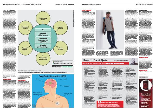 FOR medically refractory tics , deep brain stimulation ( see figure 7 ) has been tried with varying success . Deep brain stimulation involves the implantation of electrodes deep in the brain for chronic stimulation and is aimed at disrupting neural activity in the target regions . This therapy is a well-established treatment for severe and intractable Parkinson ’ s disease , dystonia and essential tremor . There have been a few reports of deep brain stimulation in severe tic disorders , including Australian cases . 28 Since this is an invasive procedure with potential risks , it should be considered only in adult patients with chronic and severe tic disorders who have medically intractable disease and severe functional impairment . Patients require evaluation by a team with expertise in the management of tic disorders , and while considering surgery for patients below the age of 18 , it is recommended that a local ethics committee is consulted .