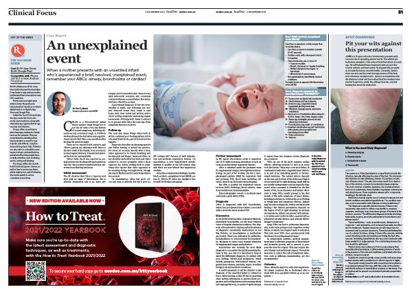 CHLOE is a five-week-old infant whose mother Jenny brings her to see the GP with a two-day history of coryzal symptoms , including rhinorrhoea and occasional cough . A COVID-19 swab performed the day before was negative . Jenny reports that Chloe was unsettled after feeding the previous night . There are no reported sick contacts , and Chloe ’ s parents are otherwise well . Chloe is the first child of the family , born at term by normal vaginal delivery . Prenatal and maternal history are unremarkable .