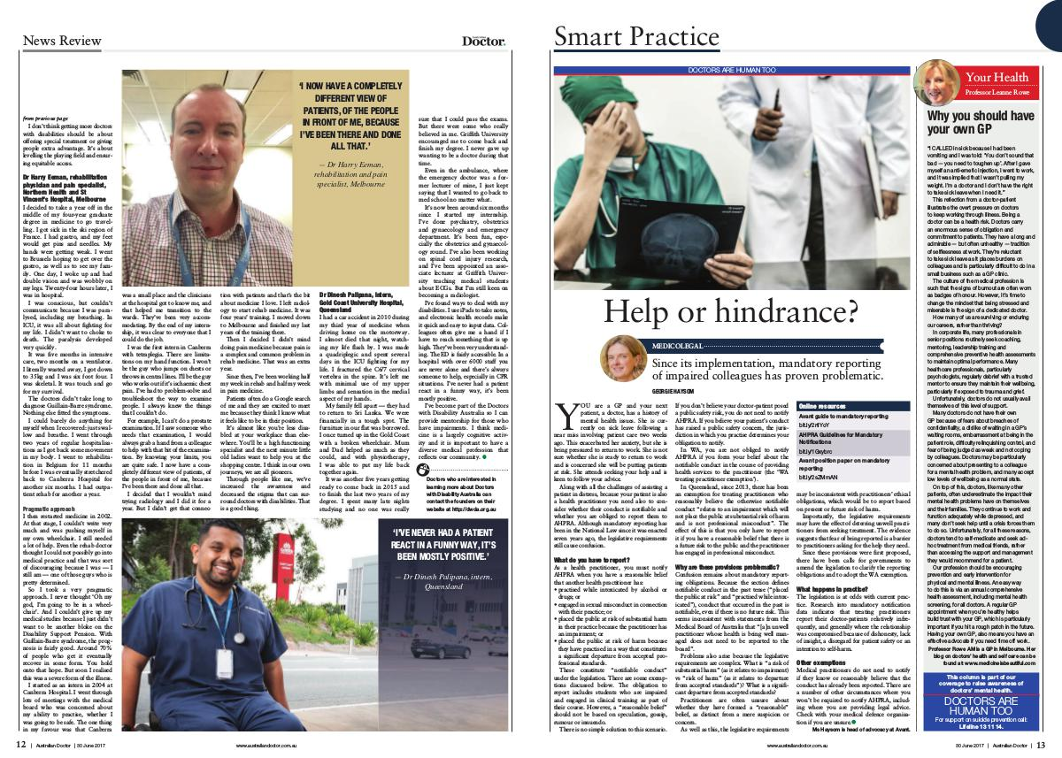 I’ ve become part of the Doctors with Disability Australia so I can provide mentorship for those who have impairments. I think medicine is a largely cognitive activity and it is important to have a diverse medical profession that reflects our community. ●