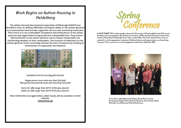 The Autism Housing Development Corporation of Pittsburgh (AHDCP) was founded in 2011 to develop affordable housing for adults on the autism spectrum in an environment that includes supportive services and community interaction. Their vision is to see communities everywhere welcoming those on the autism spectrum and support them living productive, independent lives. They believe that individuals on the autism spectrum can be valued, independent and contributing members of their communities. The inclusion of individuals on the autism spectrum in the community enriches the lives of everyone by creating an environment of cooperation and tolerance.