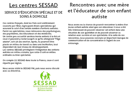 Nous avons eu la chance de pouvoir rencontrer la mère d'un jeune enfant autiste ainsi que son éducateur. Il nous a été très intéressant de pouvoir observer cet enfant dans une situation de son quotidien et de pouvoir observer sa relation avec sa mère et son spécialiste. À la suite de ces rencontres, nous pouvons conclure un important manque de communication et de concentration à l'égard de son entourage.