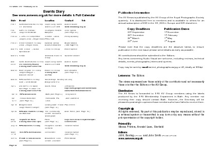 Publication Information The AV News is published by the AV Group of the Royal Photographic Society quarterly. It is distributed free to members and is available to others for an annual subscription of £20 in the UK, £22 in Europe and £24 elsewhere. Copy Deadlines Publication Dates 23rd September 24th December 24th March 23rd June 1st November 1st February 1st May 1st August Please note that the copy deadlines are the absolute latest, to ensure publication in the next issue please send details as early as possible. All contributions should be submitted to the Editors. Any items concerning Audio Visual are welcome, including reviews, technical details, events, photographs, letters and queries. Copy may be sent by email as text, photographs as jpg or tiff, ideally at 300dpi Letters to: The Editors The views expressed are those solely of the contributor and not necessarily those of either the Editors or the AV Group. Distribution The AV News is forwarded to RPS AV Group members using the labels produced by the RPS Membership Department in Bath. Any member not receiving their copy should contact Bath. However, the Secretary will be pleased to post single copies to those members who have failed to receive them. Copyright All rights reserved. No part of this publication may be reproduced, stored in a retrieval system or transmitted in any form or by any means without the prior permission of the copyright holder. Printed By Mensa Printers, Arundel Lane, Sheffield Editors Jill K. Bunting CPAGB and John Smith APAGB CPAGB www.avnews.org.uk