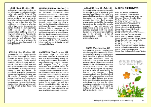 This month might be filled with unforeseen expenses or setbacks that need to be handled soundly. Making fast or hasty decisions must be avoided or they could cause you regret. A slower, well analyzed train of thought throughout any situation during the month of March will be the best course. Everyone deserves a break now and then, and this month is also a perfect time to escape for a short rejuvenating weekend getaway. Reconciling past issues with your mate or partner might lead to the answers and clarity that you've both been looking for and chart a new path for a deeper committed love life. Say what you need to say and don't be afraid to bare your soul. Your vulnerability and honesty will be handsomely rewarded.