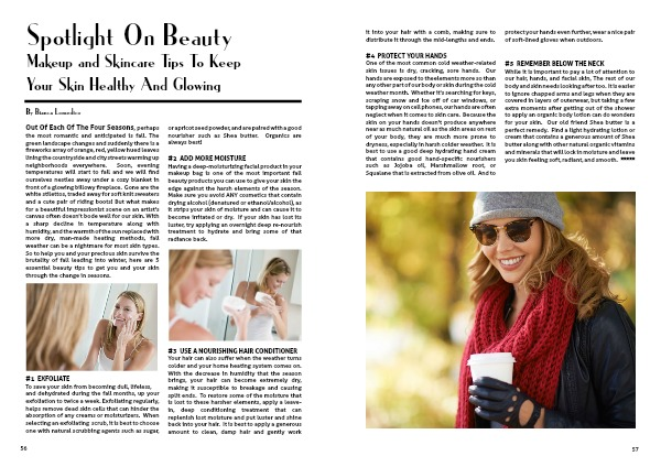 and dehydrated during the fall months, up your exfoliation to twice a week. Exfoliating regularly, helps remove dead skin cells that can hinder the absorption of any creams or moisturizers. When selecting an exfoliating scrub, it is best to choose one with natural scrubbing agents such as sugar, or apricot seed powder, and are paired with a good nourisher such as Shea butter. Organics are always best!