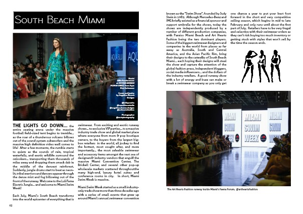 known as the "Swim Show", founded by Judy Stein in 1982. Although Mercedes-Benz and IMG briefly existed as a financial sponsor and support umbrella for the shows, today the shows are independently produced by a number of different production companies, with Paraiso Miami Beach and Art Hearts Fashion being the two dominant players. Some of the biggest swimwear designers and companies in the world from places as far away as Australia, South and Central America, and the Asian Pacific Rim, bring their designs to the catwalks of South Beach Miami... each hoping their designs will steal the show and capture the attention of the global fashion press, independent bloggers, social media influencers... and the dollars of the industry retailers. A good runway show with a lot of energy and buzz can make or break a swimwear company as you only get one chance a year to put your best foot forward in the short and very competitive selling season, which begins in mid to late February and only runs until about the first part of July. Retailers have to be very frugal and selective with their swimwear orders as they can't risk buying too much inventory or getting stuck with styles that won't sell by the time the season ends.