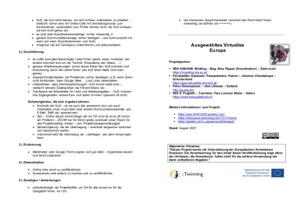 � SuS , die sich nicht kennen , tun sich schwer , miteinander zu arbeiten – vielleicht vorher eine Art Online-Café mit Vorstellungsrunde zum Kennenlernen veranstalten ( nur Profile reichen nicht , die SuS schauen sie sich nicht genau an ) � es sind viele Koordinatorenmeetings vorher notwendig � � genaue Kommunikationswege vorher festlegen – wer kommuniziert mit wem und wann ( Koordinatorinnen und SuS ) � möglichst viel auf TwinSpace unternehmen und dokumentieren