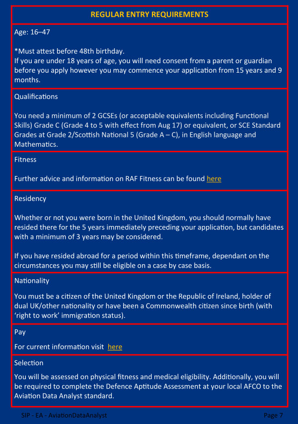 You will be assessed on physical fitness and medical eligibility. Additionally, you will be required to complete the Defence Aptitude Assessment at your local AFCO to the Aviation Data Analyst standard.