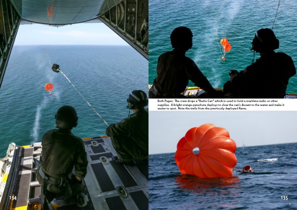 Both Pages: The crew drops a "Radio Can" which is used to hold a maritime radio or other supplies. A bright orange parachute deploys to slow the can's decent to the water and make it easier to spot. Note the trails from the previously deployed flares.