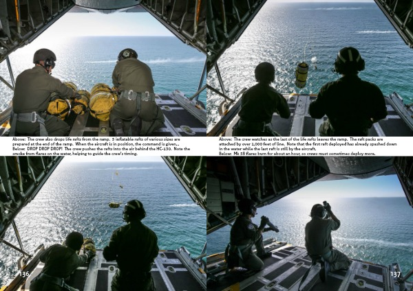 Below: DROP DROP DROP! The crew pushes the rafts into the air behind the HC-130. Note the smoke from flares on the water, helping to guide the crew's timing.