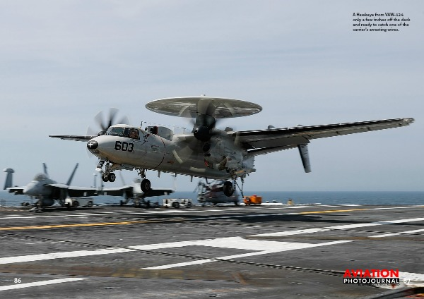 A Hawkeye from VAW-124 only a few inches off the deck and ready to catch one of the carrier's arresting wires.