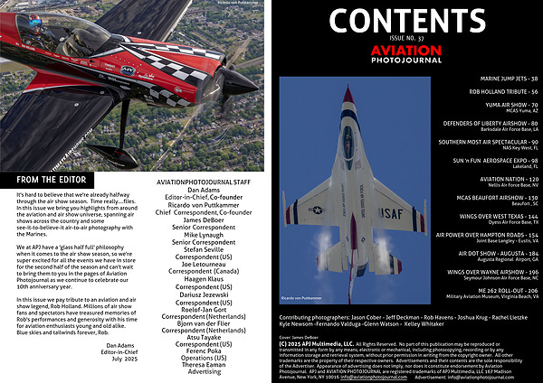 (C) 2025 APJ Multimedia, LLC. All Rights Reserved. No part of this publication may be reproduced or transmitted in any form by any means, electronic or mechanical, including photocopying, recording or by any information storage and retrieval system, without prior permission in writing from the copyright owner. All other trademarks are the property of their respective owners. Advertisements and their contents are the sole responsibility of the Advertiser. Appearance of advertising does not imply, nor does it constitute endorsement by Aviation Photojournal. APJ and AVIATION PHOTOJOURNAL are registered trademarks of APJ Multimedia, LLC 167 Madison Avenue, New York, NY 10016 info@aviationphotojournal.com